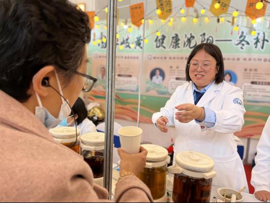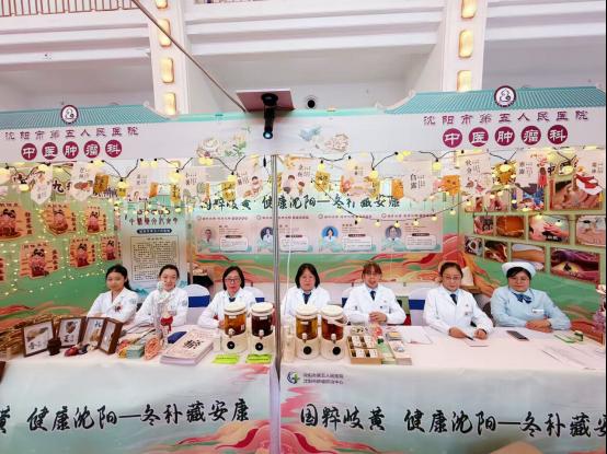 随着一阵清风拂过,印着“冬至”“小雪”的二十四节气彩旗轻轻摇曳,为古朴的青瓷药罐添了几分灵动。诊桌前,脉枕、听诊器与人体穴位模型整齐排列,几位白大褂绣着“沈阳市第五人民医院”字样的专家正凝神坐诊。