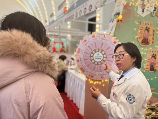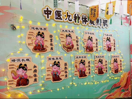 走进市集,仿佛踏入一条跨越千年的时光隧道。沈阳市五院的健康服务摊位灯火通明,在喧嚣中格外醒目。“时辰养生”转盘巧融中医十二时辰与脏腑养生理论,为市民递上精准分时健康指南;“为养生打call”的国风立牌碰撞传统中医元素与年轻养生语境,呈现趣味满满的“花式养生”场景,尽显传统养生文化在年轻群体中的创新破圈活力;卡通风格的“中医九种体质辨识”图,通过趣味化的人物形象和症状标注,清晰展示了中医对人体体质的分类及特点。