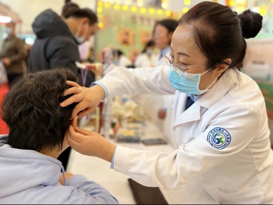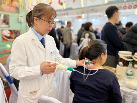 中医疗法体验区被层层人群围住,成为最火爆的打卡点。中医科主任何妍指尖轻捻王不留行籽,目光专注,精准锁定耳部关键穴位。她手法娴熟灵动,轻按慢捻间力道通透直达肌理,动作轻柔却暗藏巧劲。操作间隙,何主任还耐心讲解按压频次与力度要领。刚体验完的张女士连连赞叹:“医生的耳穴压豆太神奇了!就几分钟的功夫,困扰我多年的头疼居然缓解大半,真是古法良方显奇效!”