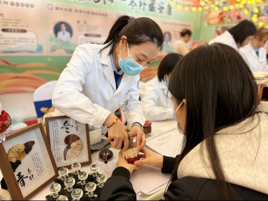 药食同源展区同样人气爆棚,展柜上摆满了古色古香的木质食盒,里面装着黄芪、红花、川芎等12种药膳食材,醒目的标签上,详细标注着功效说明和适宜人群。展柜前的小桌上,四季养生壶冒着热气,从琥珀色到晚霞红的茶汤散发着迷人的香气。市民王女士端起一杯清热生津茶,抿了一口后眼睛一亮:“既好喝又养生,我也学学回家给孩子煮!”现场还摆放着研磨器,几位医生正为市民免费研磨中药香料,细微的药粉簌簌落下,香气愈发醇厚。