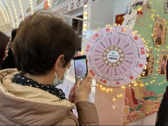 踏入市集,市五院的健康服务摊位格外醒目,除了网红的体质辨识图,一个1.7米高的十二时辰养生转盘更是吸引了来往的市民:07:00-09:00主受纳养胃,要吃好早饭,17:00-19:00主贮藏精华养肾,要少吃晚饭,在专家们通俗易懂的讲解下,很多年轻人纷纷打卡拍照,分享到社交平台,让中医文化随着九宫格的朋友圈传递到更多人身边。