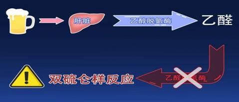 正常情况下,人体摄入酒精后,90%以上在肝脏代谢,乙醇在肝脏内经过乙醇脱氢酶的作用转化为乙醛,再通过乙醛脱氢酶进行下一步转化。双硫仑和作用机制类似的药物可以抑制肝脏中乙醛脱氢酶活性,使乙醛代谢受阻,体内乙醛浓度升高,当乙醛蓄积达到一定浓度,甚至可能引起猝死。