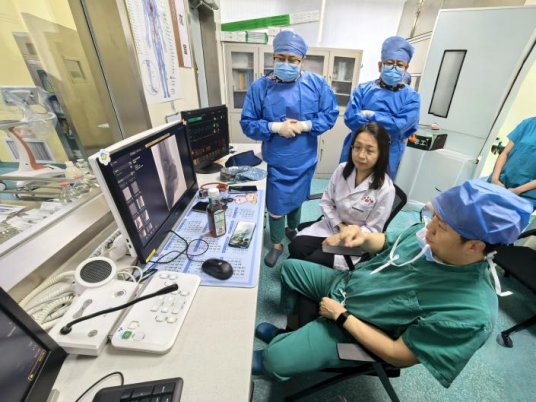 调研当日,郭连瑞教授深入医院介入导管室,全程观摩并指导了一例严重缺血性糖尿病足患者的下肢动脉腔内治疗手术。他对中心在膝下血管病变等复杂介入操作中展现出的精准判断、精细技术和高效流程给予了高度评价,并就关键技术的进一步提升进行了现场指导。