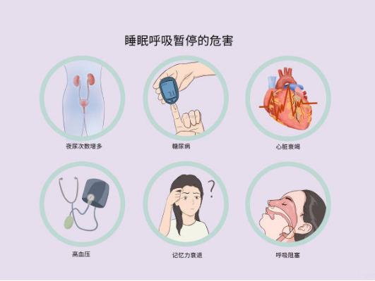 当呼吸暂停发生后,睡眠结构紊乱,呼吸气流中断,随之患者出现缺氧和高碳酸血症,造成全身多系统的损害,比如:高血压、冠心病、心律失常、糖尿病、肾病、脑卒中、记忆力下降、老年痴呆、精神异常、夜间猝死……
