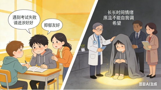 每个人在遇到挫折、压力或者不如意时,都可能会体验到,表现为情绪低落、不开心、提不起劲。但一般不会出现严重的躯体症状、强烈的自责或无价值感。通常有明确的现实原因,比如考试失利、工作压力、失恋、与人争吵等。一般程度较轻,虽然感到难过,但通常可以自我调节缓解。持续时间短,通常是几天到一两周,随着时间的推移或事情的解决,情绪会慢慢好转。可能会暂时影响心情和效率,但基本的社会功能,如工作、学习、社交能够维持。我们可以通过跟朋友倾诉、休闲娱乐,运动等放松方式,让抑郁情绪恢复过来。